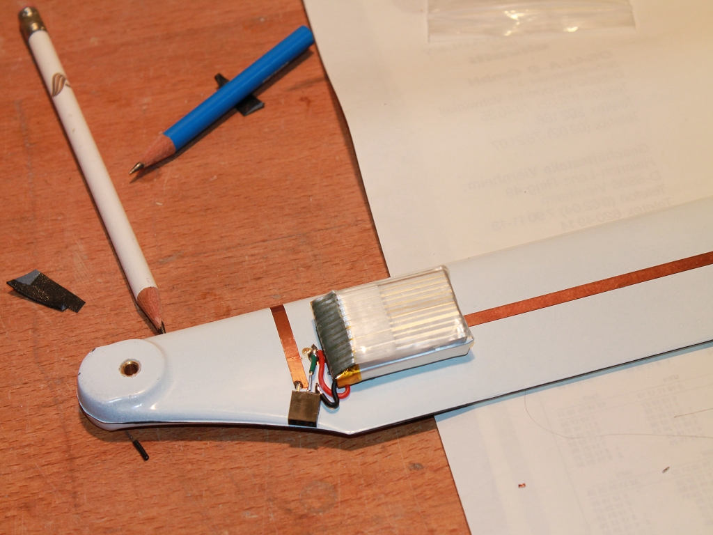 Probleme gab es nach der Fertigung beim Wuchten. Ich denke ein Akku ist dicker (schwerer) wie der andere Akku deshalb erforderte es etwas Tesa und ein längeren Schrumpfschlauch um die Blätter zumindest gleichschwer zu haben.