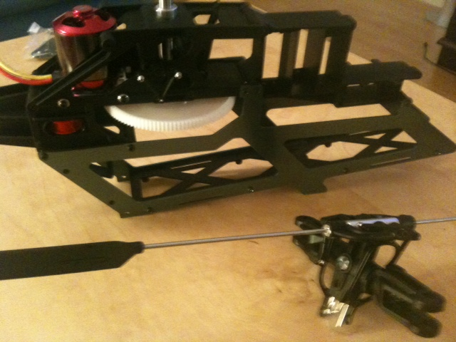 Motor ist drin, Zahrad auch. Der Kampf began mit dem Rotorkopf und der Paddelstange.