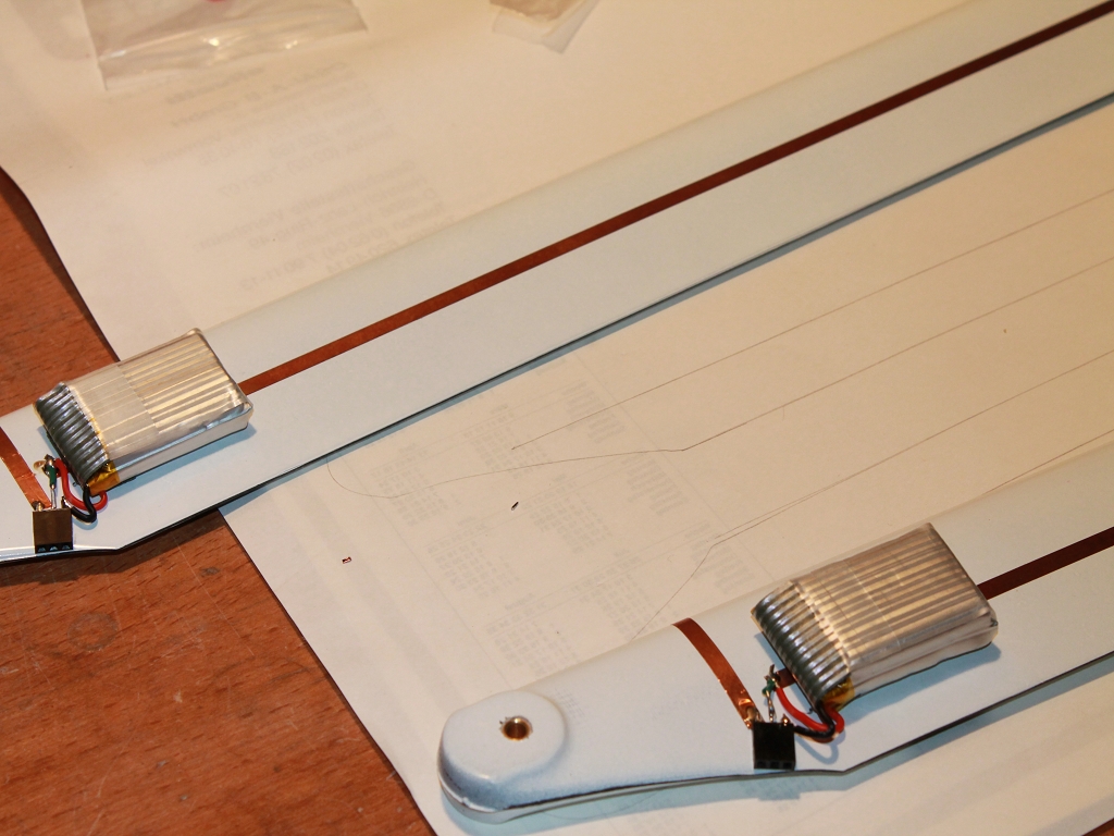 Probleme gab es nach der Fertigung beim Wuchten. Ich denke ein Akku ist dicker (schwerer) wie der andere Akku deshalb erforderte es etwas Tesa und ein längeren Schrumpfschlauch um die Blätter zumindest gleichschwer zu haben.