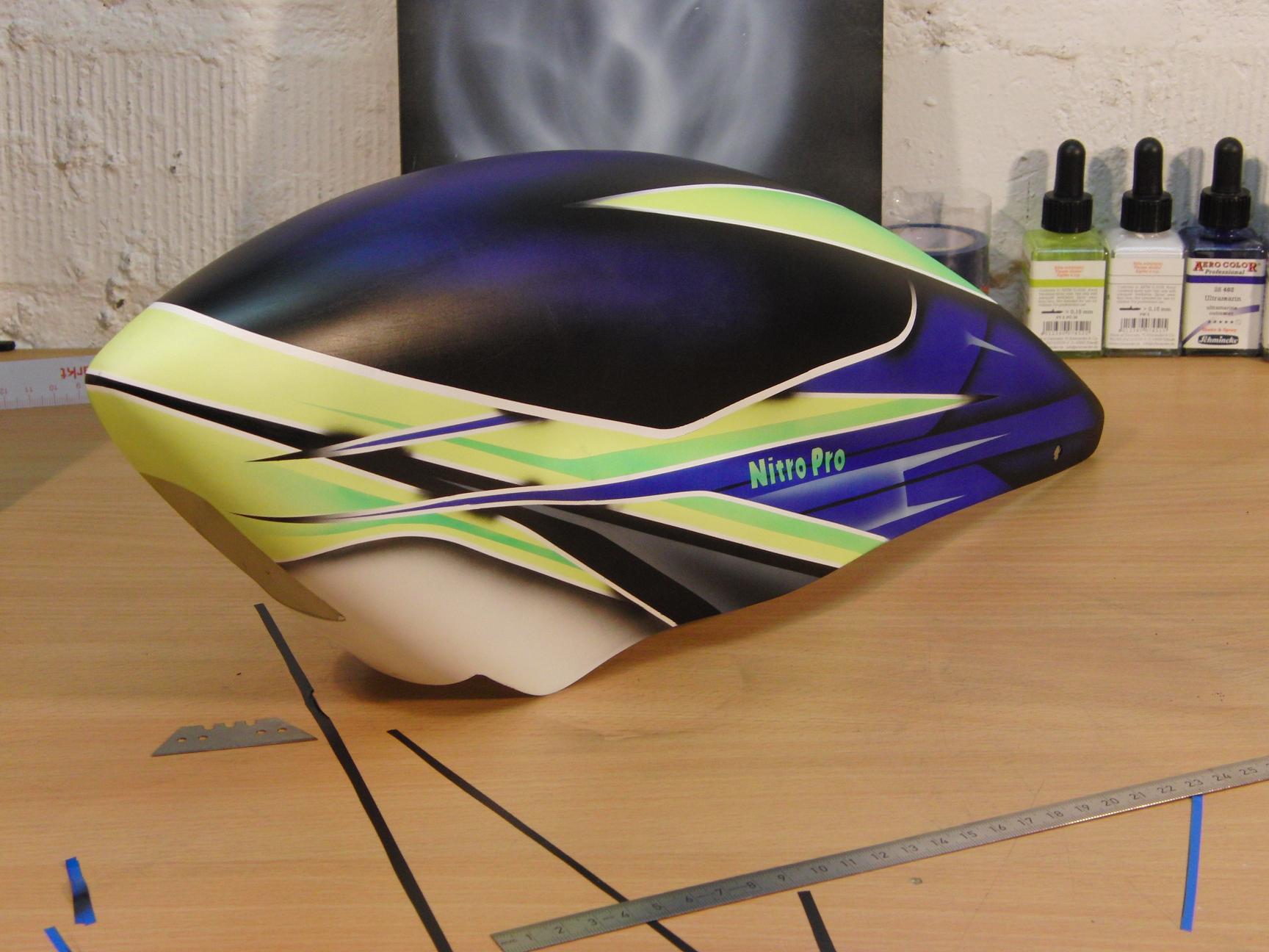 Also an dieser ersten Haube war ich locker 25-30 Sdt. dran. Habe natürlich immer wieder geübt, bevor der nächste Schritt auf die Haube kam. Eine 600er Nitro Haube ist schon bestellt. Hoffe das ich es nochmal hin bekomme...