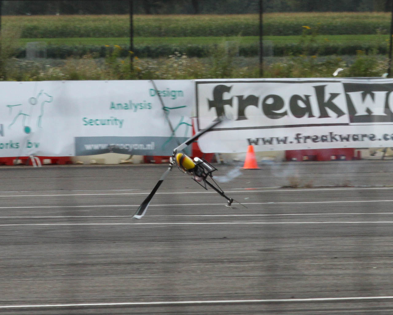 Ja, das war ein ziemlicher Hammer, dass das Ding runtergekommen ist. Die Maschine hat 3 m Rotorkreis und ein MTOW von 90 Kg (!), und ich kann nur sagen, das hat beim Einschlag ganz schön dumpf geknallt! Glücklicherweise ist er auf der anderen Seite des Platzes runtergekommen.